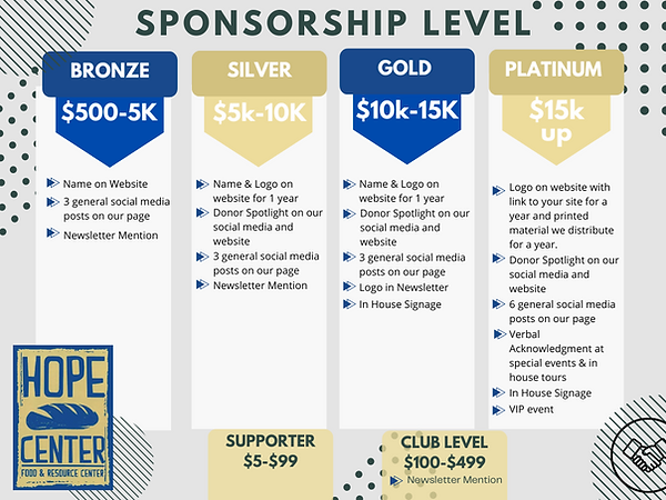 I am sure you are aware of the important role Hope Center plays in helping people whose lives are impacted by hunger and the underserved population. This important work is supported largely by the support of generous donors. To the left, you will find our Sponsorship Level Chart. We ask you to look at it and decide how you can help! Every donation, no matter the size, take us one step closer to maintaining and achieving our goal of increasing community services for those in need. Thank you for your consideration and continued support. If you would like more information or a visit with our Executive Director, Dr. Deena Fisher or Shanna Gonser; please don’t hesitate to reach out via email.